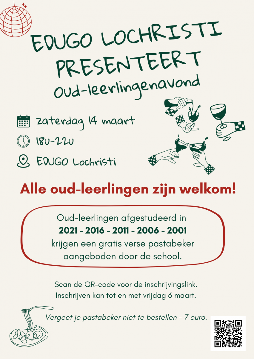 Ben je benieuwd wie je oud-klasgenoten zijn geworden en wil je nog eens herinneringen ophalen aan je schooltijd? Dan ben je van harte welkom op onze jaarlijkse oud-leerlingenavond! Een gezellige avond vol verhalen en een vleugje nostalgie met een hapje en een drankje.